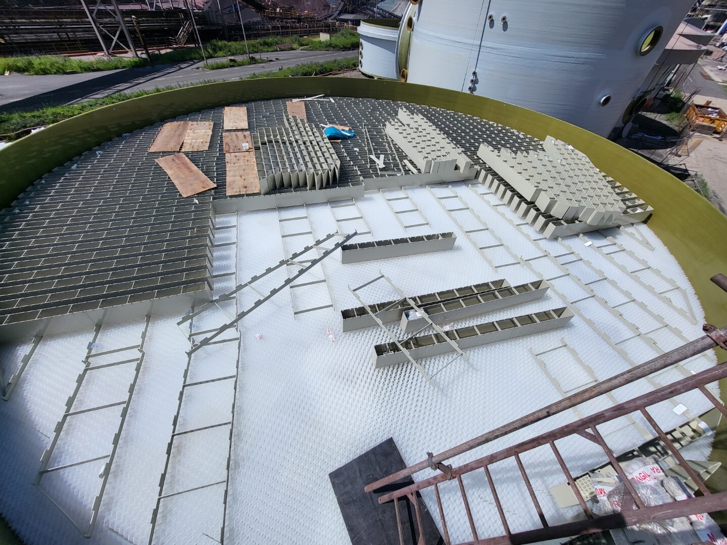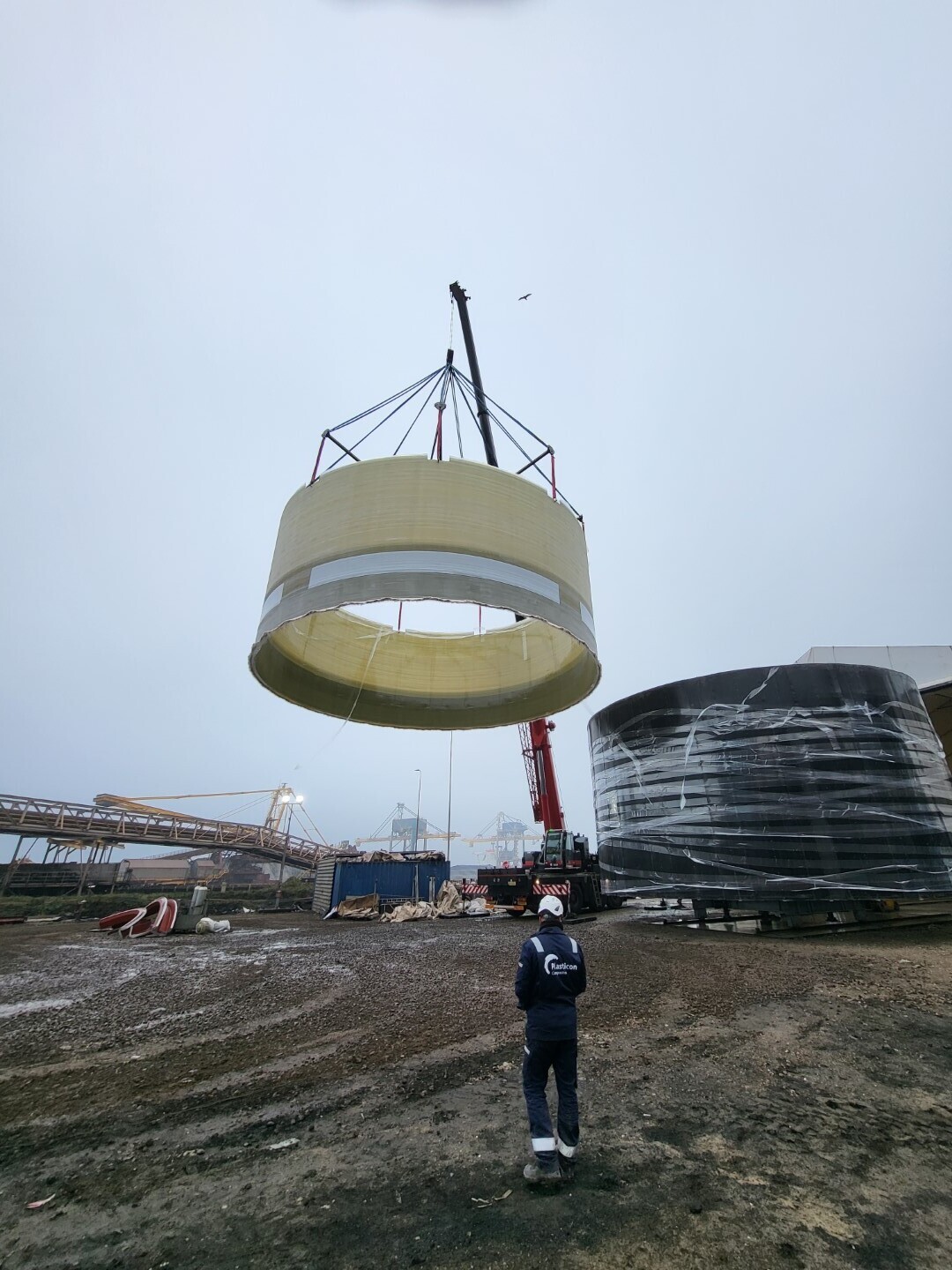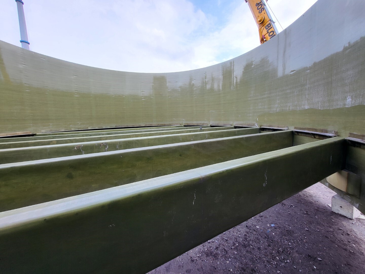 El depurador DeNOx, con su imponente diámetro de 12,5 metros, presentó desafíos únicos en términos de ingeniería y logística. Debido a su tamaño, los métodos tradicionales de transporte no eran viables. Plasticon Projects optó por la construcción in situ, utilizando sus avanzadas máquinas móviles de enrollado para fabricar el depurador directamente en Tata Steel IJmuiden. Este enfoque garantizó la integridad estructural de la instalación, al mismo tiempo que optimizó la eficiencia y minimizó los posibles riesgos relacionados con el transporte.