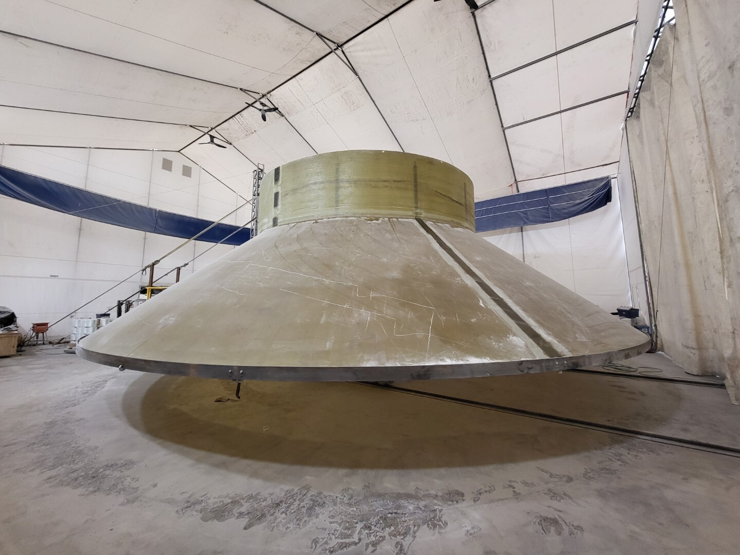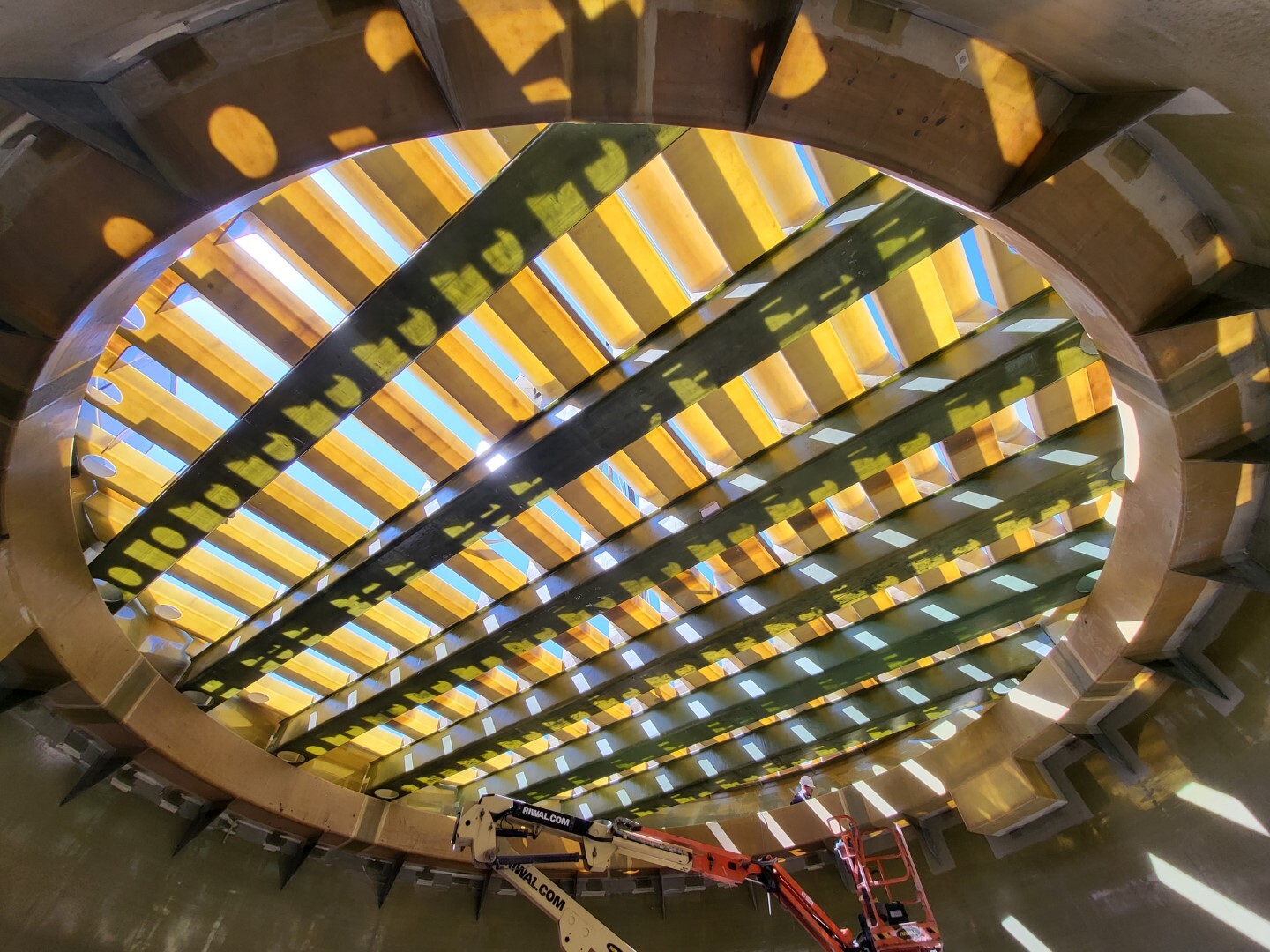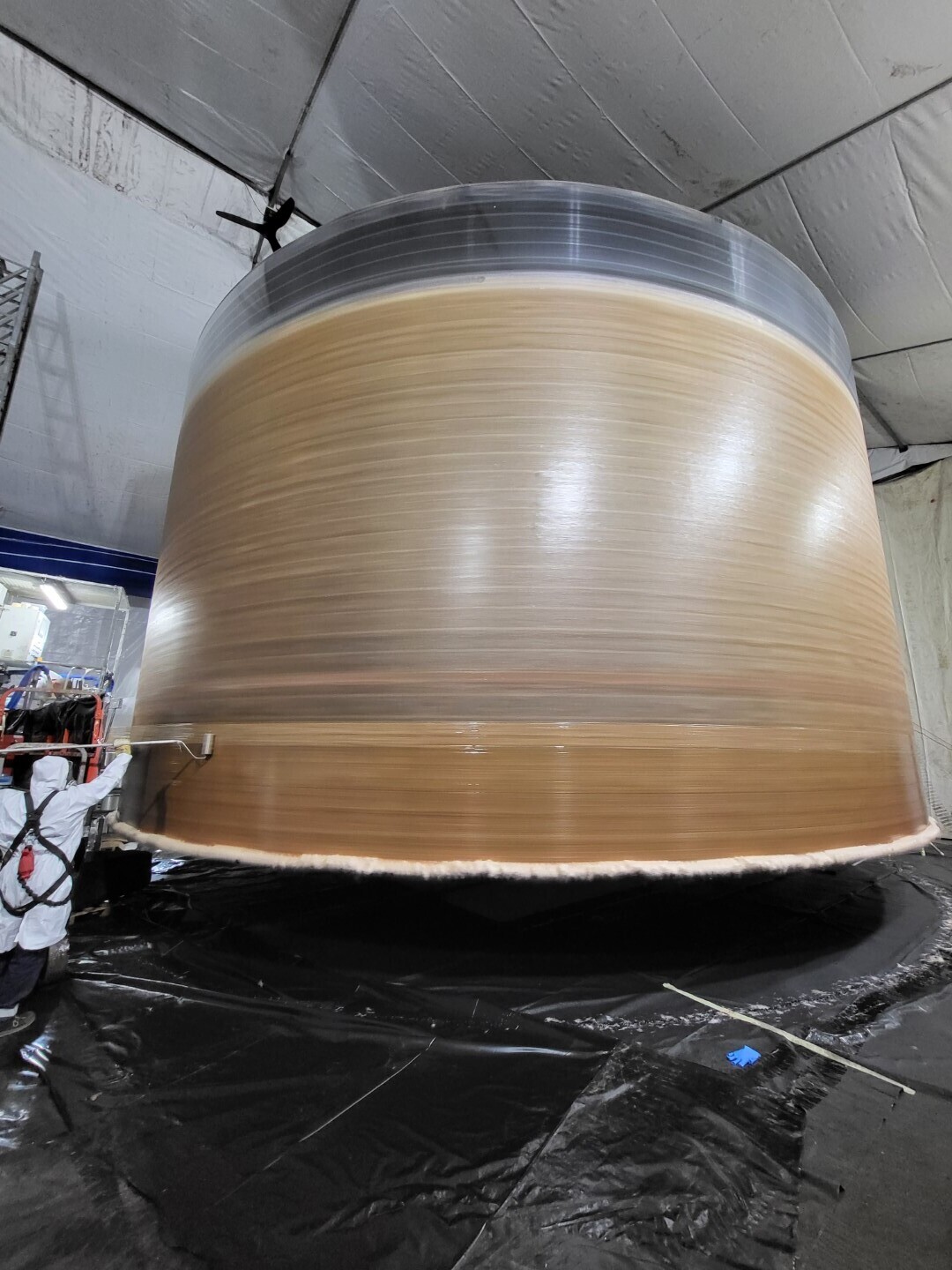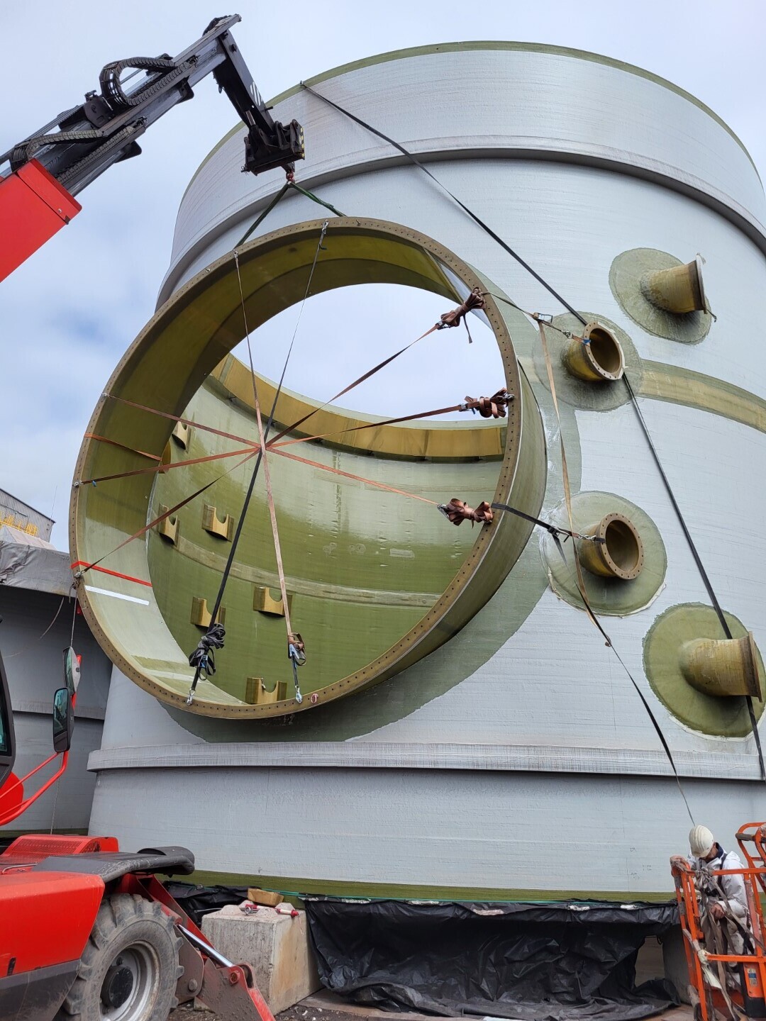 El depurador DeNOx, con su imponente diámetro de 12,5 metros, presentó desafíos únicos en términos de ingeniería y logística. Debido a su tamaño, los métodos tradicionales de transporte no eran viables. Plasticon Projects optó por la construcción in situ, utilizando sus avanzadas máquinas móviles de enrollado para fabricar el depurador directamente en Tata Steel IJmuiden. Este enfoque garantizó la integridad estructural de la instalación, al mismo tiempo que optimizó la eficiencia y minimizó los posibles riesgos relacionados con el transporte.